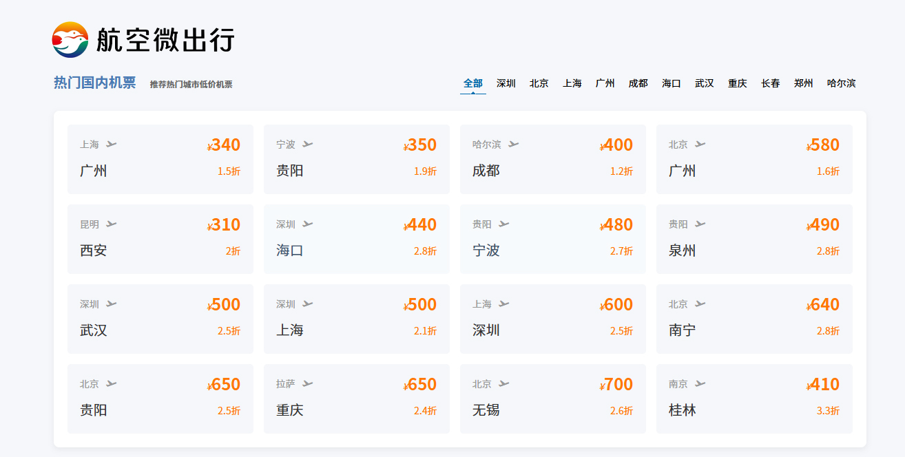 出发地(上海)→目的地(广州),特惠价340元(1.5折)